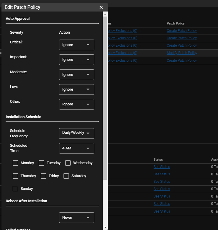 Would be nice to see something in the GUI which shows that there is no schedule to install patches when it inherits an automation policy which doesn't approve patches and have no schedule to install.