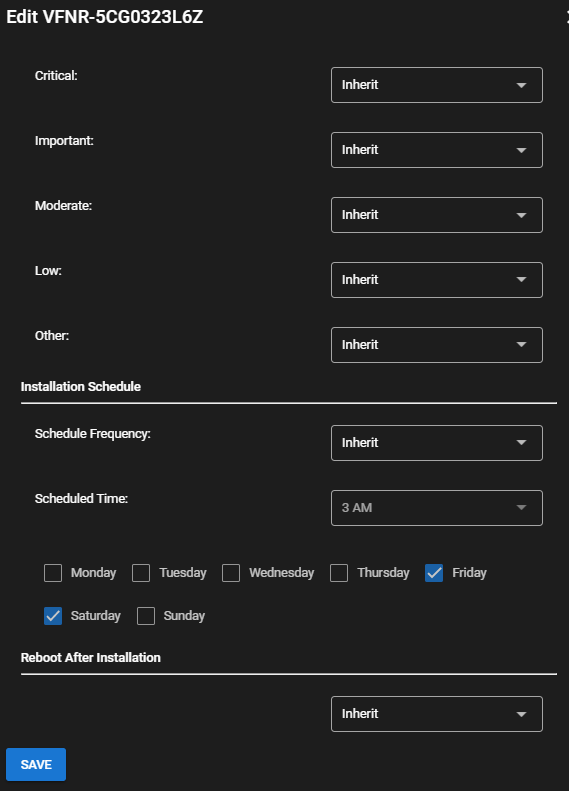 In that matter a feature reqeust could be to also show the Schedule Time to Inherit and now show the weekdays on the device itself, since it will show in the patch policy. Or that the weekdays show the same as the days in the patch policy. That is not the case right now.
