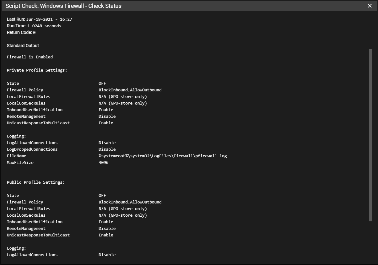 The "Windows Firewall - Check Status" script will print "Firewall is Enabled" and exit with code 0 any time the Domain firewall profile is still enabled but the Public and/or Private firewall profiles are disabled, regardless of what the current network type is