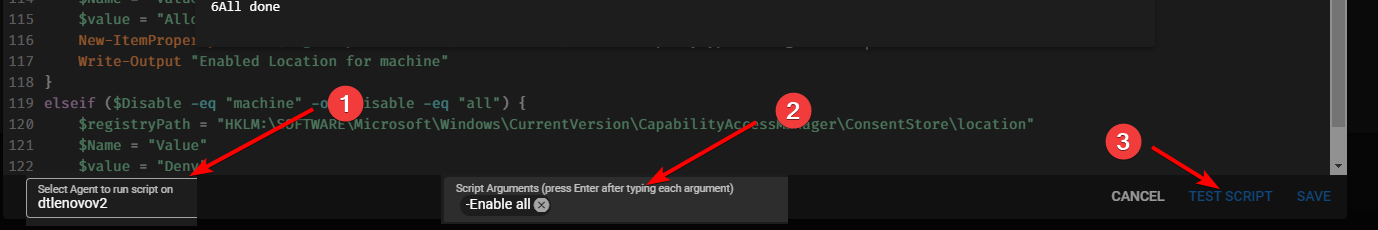 The "Test Script" function being another popup dialog makes for constant choosing agent and entering arguments every time you want to make a change and test. Is it possible to have it look more like this: