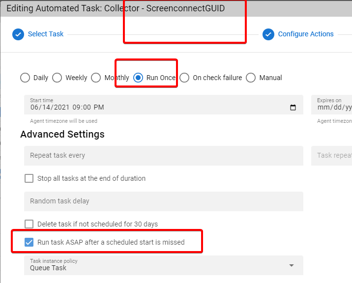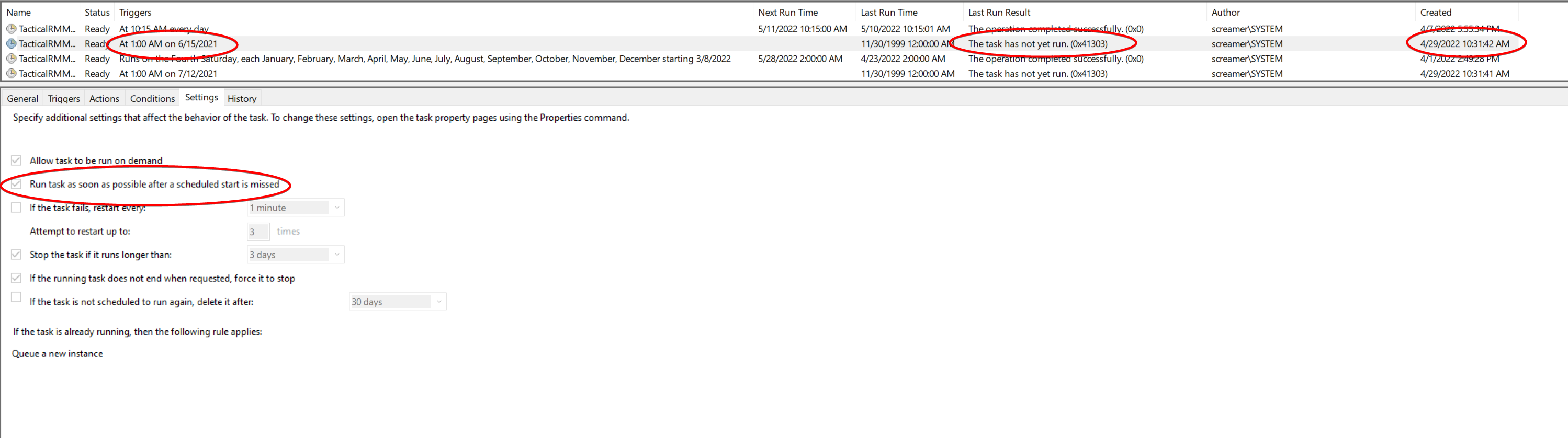I have attached a video now. Yes windows will not run if missed unless the time has already passed, so to get around that, when you create the task using trmm and set the date in the past, trmm will notice that the date is in the past, and change it to the current time + 5 minutes, before sending it to the agent. So it will be created with a date in the future, not past (in trmm web UI it will show the past time, we need to fix that, but if you look in task scheduler the time will be in the future, as shown in the video).
