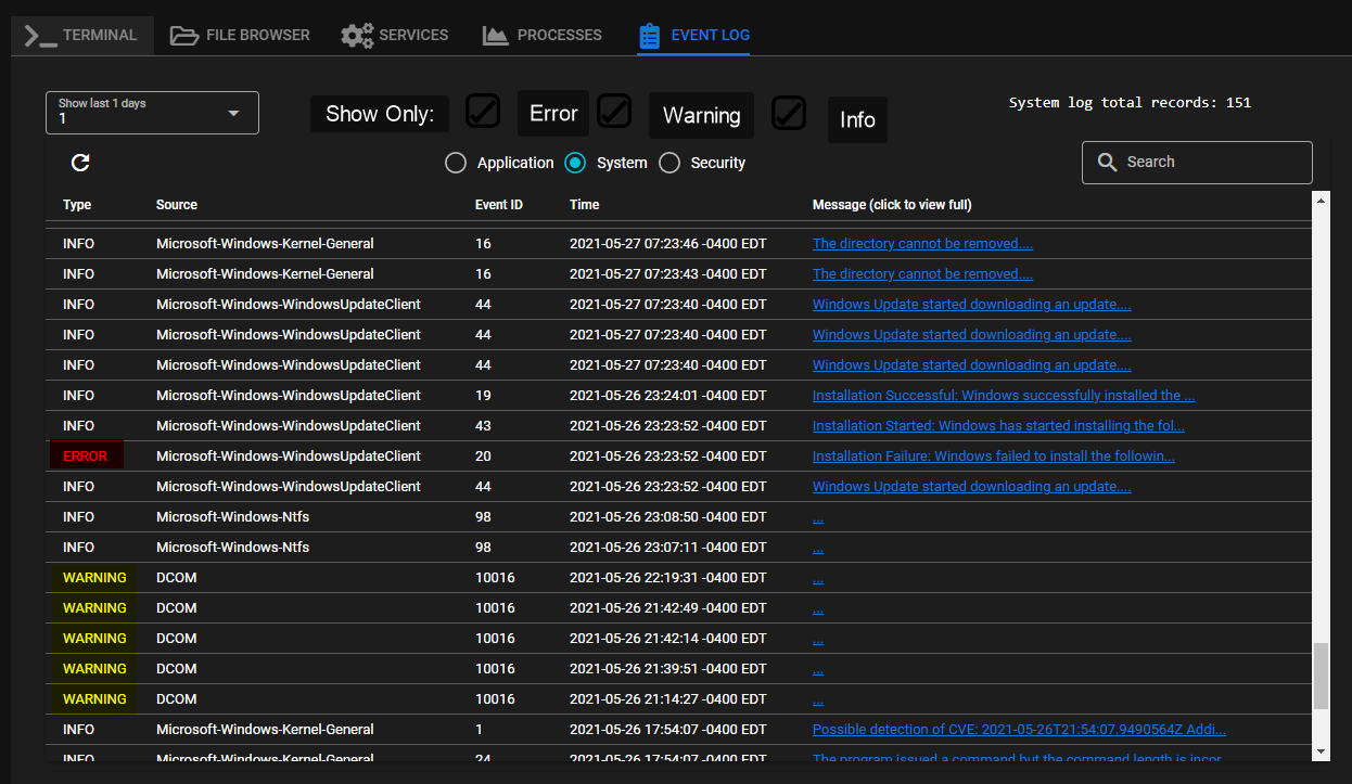 Checkboxes that hide/show those types (remembers your settings across clients). ie if someone unchecks info, it will be unchecked for all agents/Event Logs (they probably aren't interested in info logs)