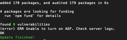 "ERR Unable to turn on AOF. Check server logs." Getting this error at the end of a version update, after all services are automatically started back up.