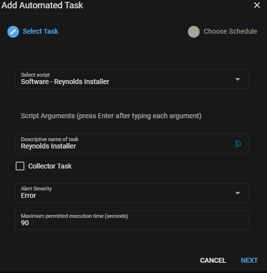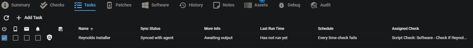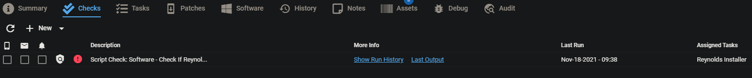Not sure if bug, or I'm misunderstanding the "Script Checks" option. Currently I have a Powershell script check that looks for installed software, if the software is installed it exit's with code 0 (success, as I want the software to be installed), if the software is not installed it exit's with code 1. Under my test device that check shows "Error" which is the result I want, as the software is not installed on the test machine. If the check fails, I have a task set to run that will install the software, that task just sits with "Synced with Agent", "Awaiting output", "Has not run yet" even though the schedule is set to "Every time check fails" and the "Assigned Check" is the script check that is in failed status. My script check for the software is here: https://ghostbin.com/QdWNE ("Software Name Here" is the name of my program in Programs and Features, verified it returns codes correctly depending on whether software is installed)