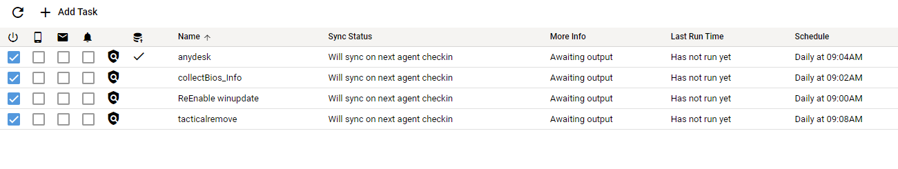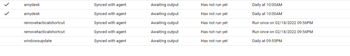 A scheduled task for my automation policy looked like it was being run on agents that have had the agent installed for over 2 months, but the output of the scheduled task was showing that nothing was being run. On agents that had just been recently added to tacticalrmm (younger than 2 months), the scheduled task would modulate between "Waiting for task creation on agent" and something about waiting for next agent check-in.