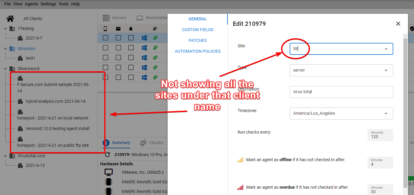 So you can search when editing an agents site. Yes, you still need to select a site in the end...but it would be nice for the results to include the client name (even though you'll have to select a site under that client name result for it to be selectable)