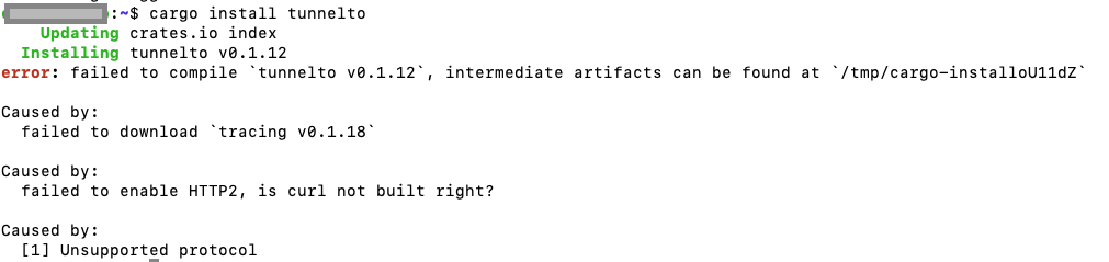 It looks like curl is not built with http2 — can you try reinstalling curl or see if there’s a way to install it with http2 support? This is an issue with simply downloading a dependency for cargo (not even at the installation step).