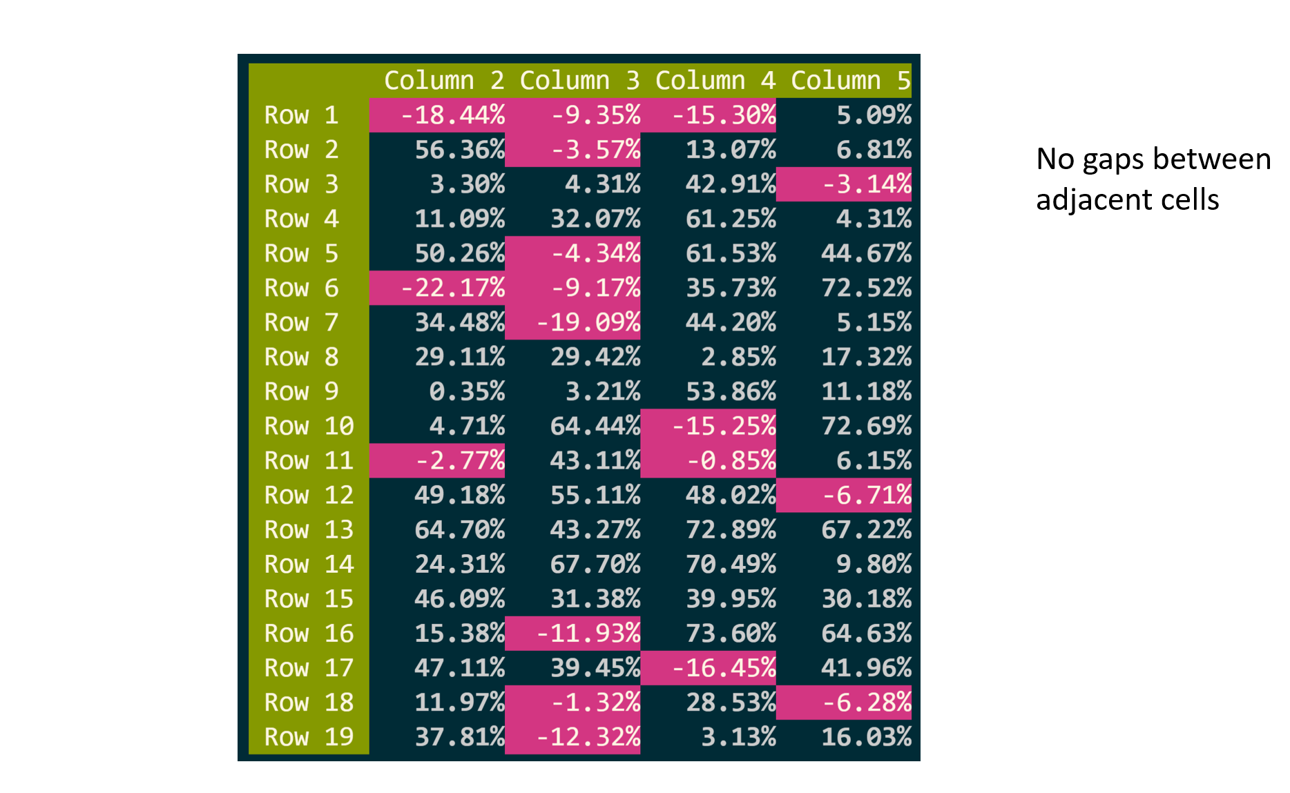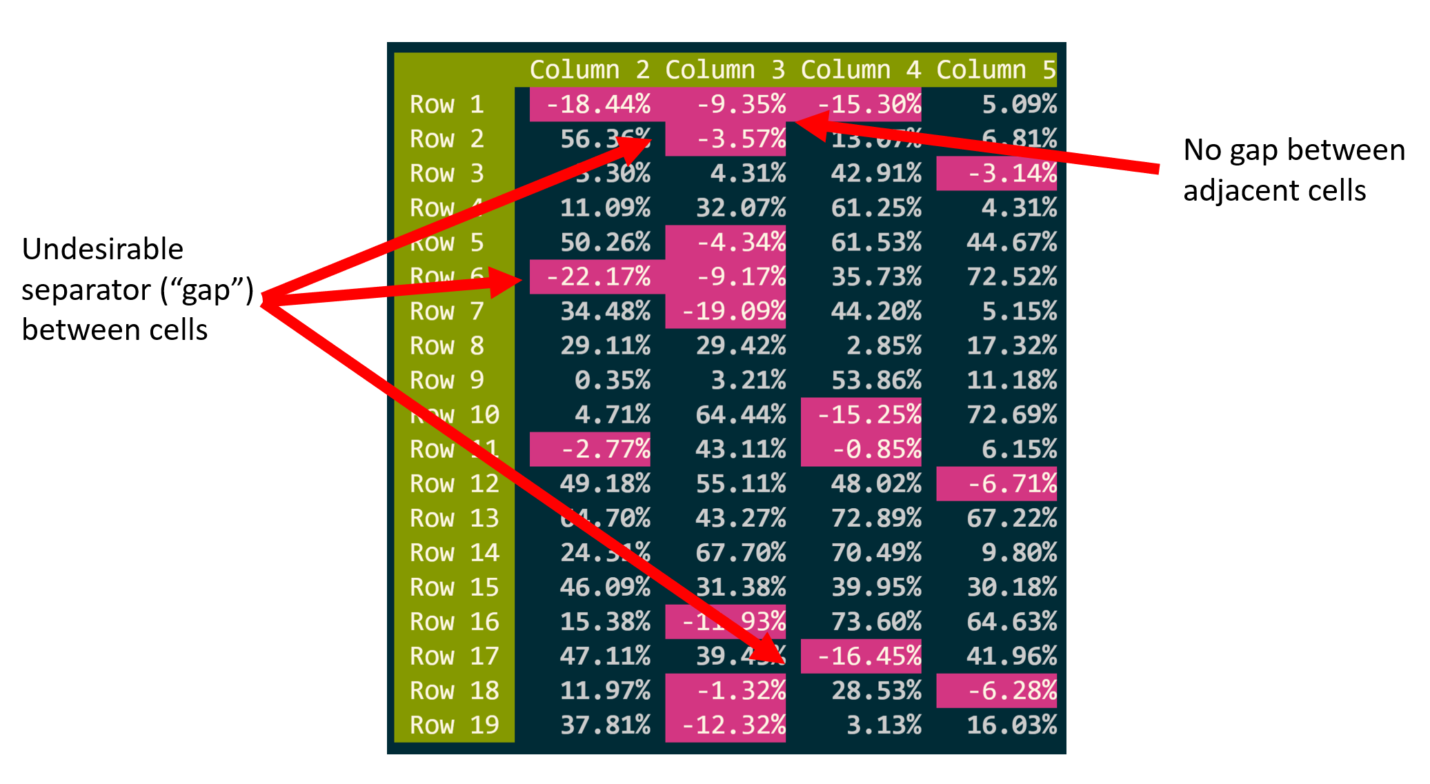 SetBorders(true)) illustrates how the situation is much more complex than what can be seen in your screenshots:You can see that the current code joins neighbouring cells' background if they are the same. (Not so with joining horizontal lines.) Here we also have a green cell ("Row 1") and a magenta cell ("-18.44%"), divided by a vertical line. Does the vertical line's background need to be colored? And if so, should it be green or magenta?