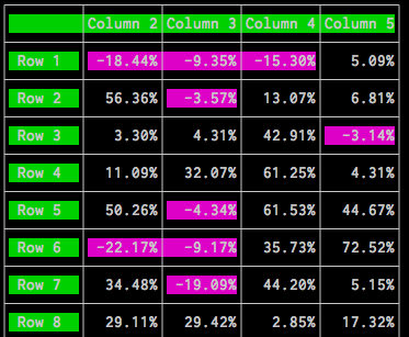 NewTableCell()constructor or explicitly define a background color now becausetcell.Colordefaults to black (see #1 for where this would cause issues).Also, it's quite difficult to make this work with borders. You examples don't have character-wide/high borders but in a terminal, it looks odd when a cell has a background color but the cell borders don't. I implemented a simple solution for now. Might improve this later on.