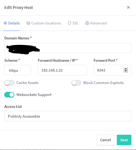 https://192.168.1.22:8343is the address to access bitwarden_rs? Maybe you need to select http there if you are configuring HTTPS in the proxy and not in bitwarden_rs?@ataylor1988 commented on GitHub (Nov 21, 2019):
