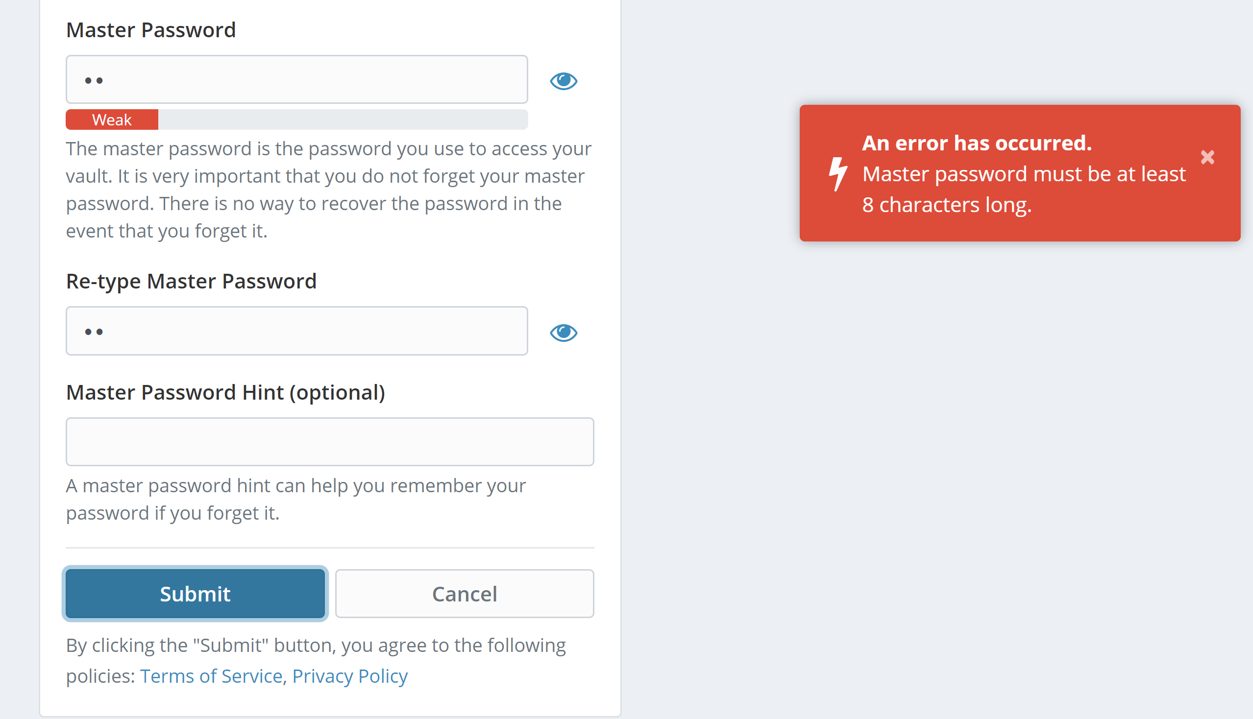 if (strengthResult != null && strengthResult.score < 3) { this.platformUtilsService.showToast('error', this.i18nService.t('errorOccurred'), this.i18nService.t('weakMasterPassword')); return; /**const result = await this.platformUtilsService.showDialog(this.i18nService.t('weakMasterPasswordDesc'), this.i18nService.t('weakMasterPassword'), this.i18nService.t('yes'), this.i18nService.t('no'), 'warning'); if (!result) { return; }*/ }These changes seem to: