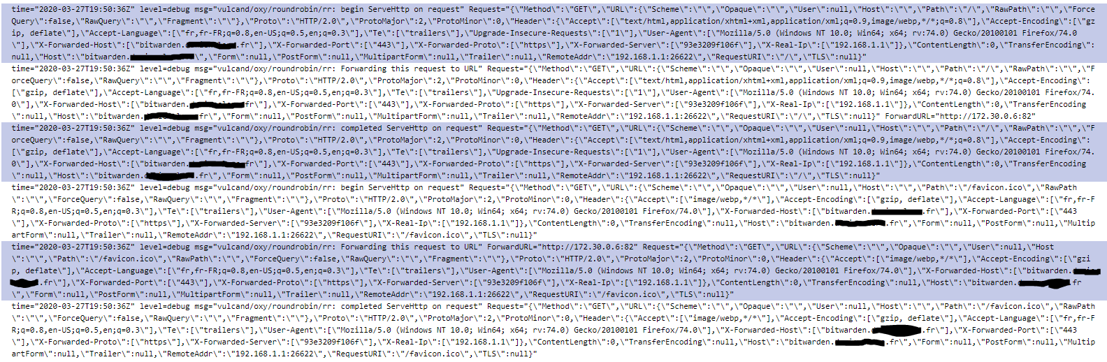 The Traefik's logs when I try to access to my "bitwarden.mydomain.com" :