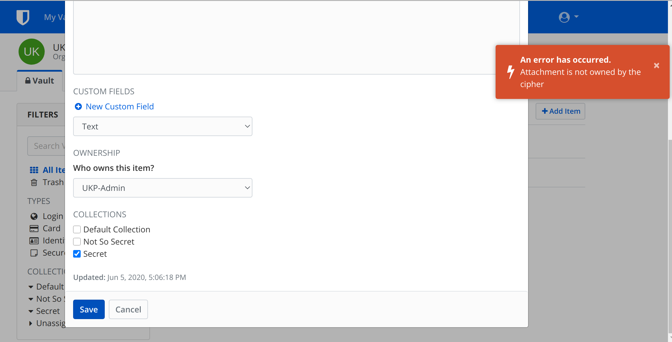 Error toast "Attachment is not owned by the cipher", bitwarden_rs returns 400, empty entry is created