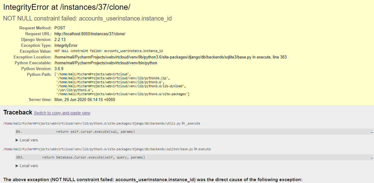 "The above exception (NOT NULL constraint failed: accounts_userinstance.instance_id) was the direct cause of the following exception:"