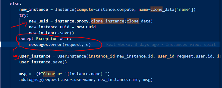 except Exception as e: messages.error(request, e) catches it print messages then try to save instances to user instance, but there is no new_instance uuid and new_instance.id