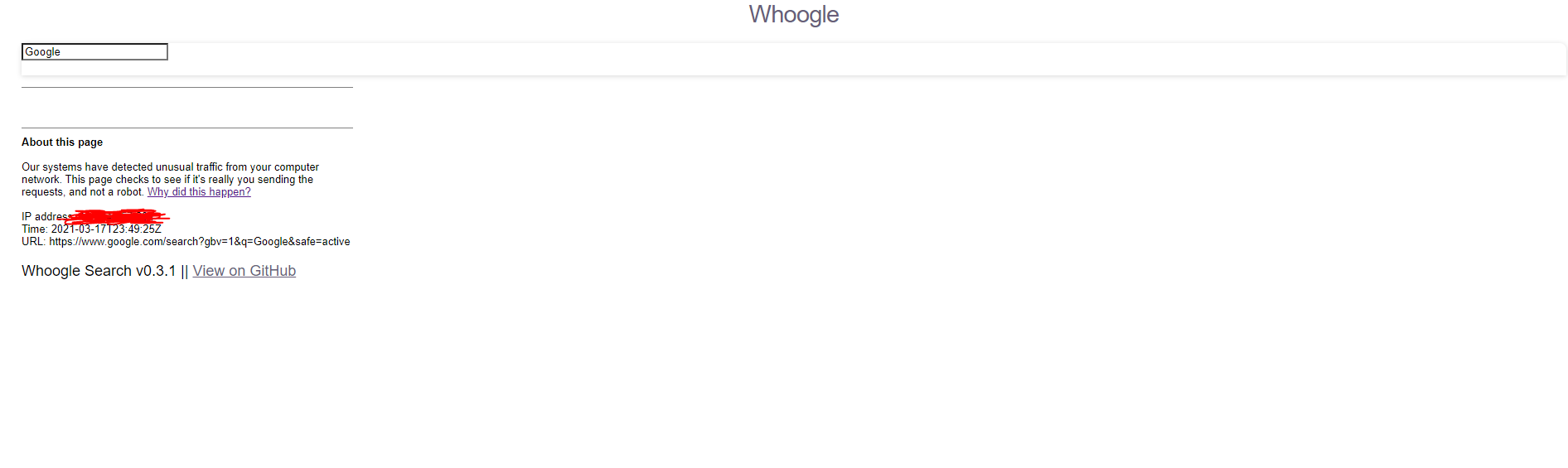 Whoogle is telling me that unusual traffic is coming from my PC (I'm using a VPN) and I'm not getting a captcha to fix this. I am using Docker and this just started happening to me now.