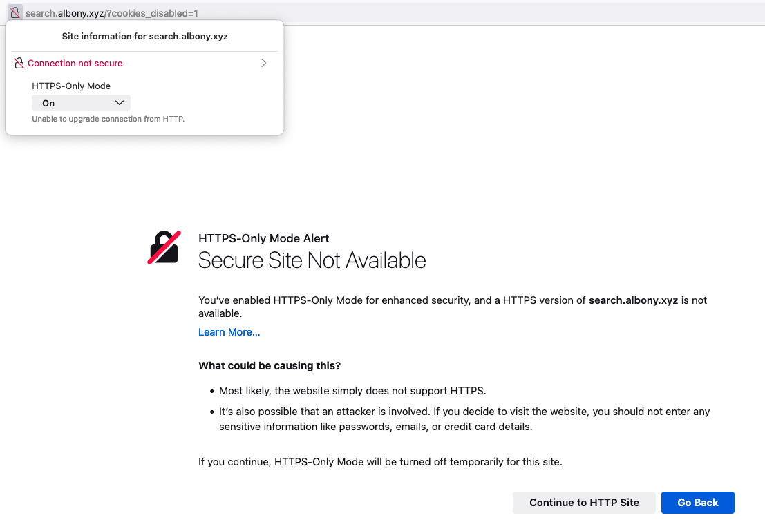about:configrelated instead of caused by HTTPS-Only-Mode.I had something similar happen a while ago and somehow managed to fix it after fiddling with the whoogle/proxy config files for quite a bit... can’t remember the exact fix or version I used back then though.