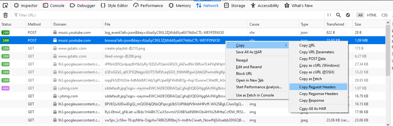 First you log in to YouTube Music, then you press Ctrl-Shift-I and click on the library tab. Copy the request headers as shown in the screenshot (Network tab):