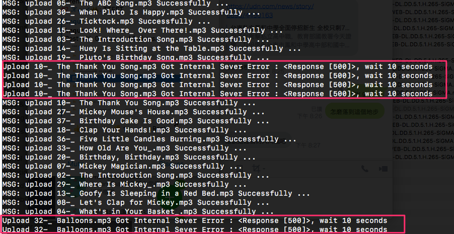 If I use a loop to upload files in a folder, it will random get response "500" error during file uploading. Need to wait some time (~ 1mins) , and resend