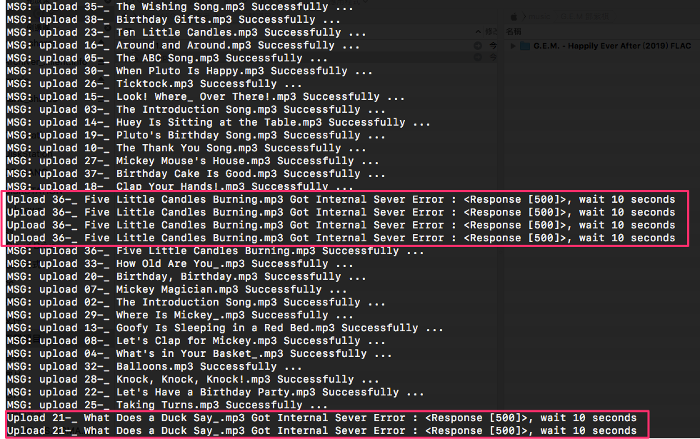 @sigma67 did you change something? I was able to upload 77 mp3s with a simple for loop without getting a response 500