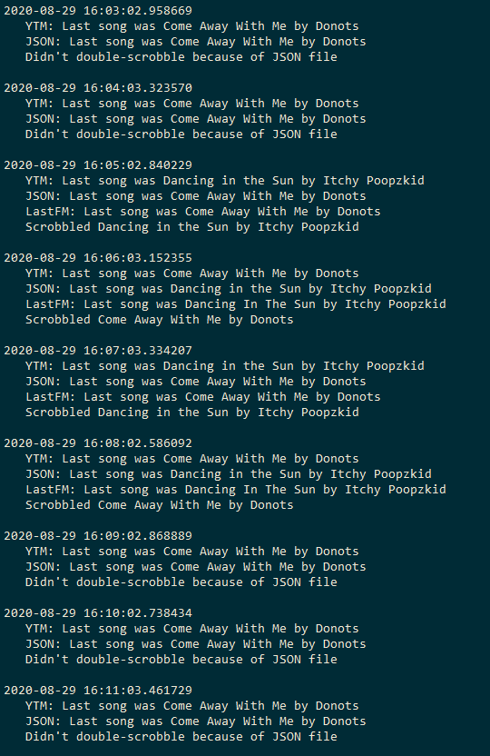 Well kind of. It's hard to tell because if you're not listening and actively looking at LastFM you can't really tell if there's a break. There's another problem: Sometimes my script logs songs which were listened to a day before aka the history returned is missing the first X entries. I'll look into it further after my exams.